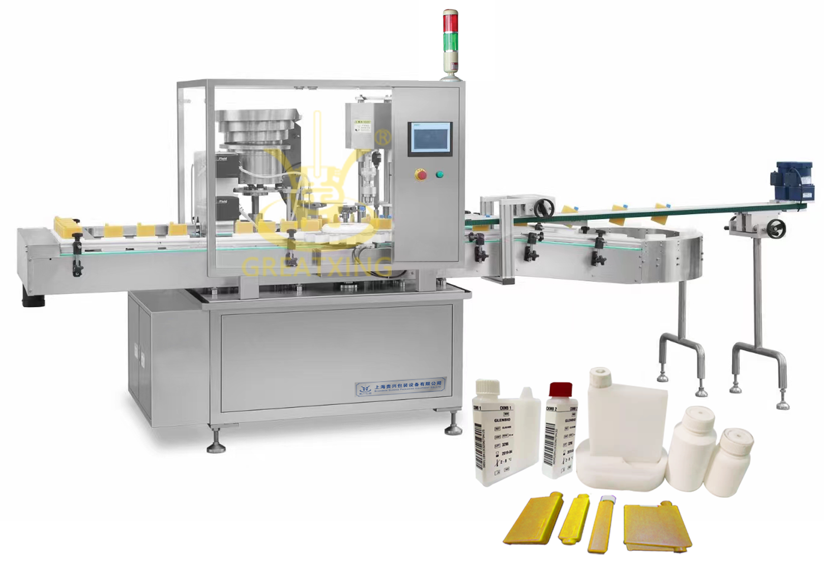 本生產(chǎn)線設(shè)備專為生化診斷試劑產(chǎn)品的生產(chǎn)而設(shè)計(jì),滿足客戶異形瓶智能化生產(chǎn)需求。灌裝系統(tǒng)采用高精度蠕動(dòng)泵灌裝,灌裝精度高,調(diào)節(jié)方便。整機(jī)采用PLC可編程控制器對相關(guān)功能進(jìn)行自動(dòng)控制,光纖檢測系統(tǒng)具有無瓶不灌裝、不上蓋,無蓋報(bào)警等功能,使用操作簡單、調(diào)整方便。